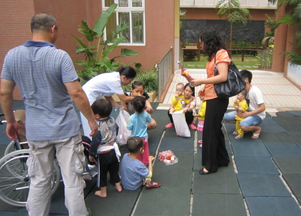 隨后,黃老師帶我們參觀了陽(yáng)光幼兒園。小朋友正好在上戶外活動(dòng)課,運(yùn)動(dòng)場(chǎng)上大概有10多個(gè)孩子,他們有的在玩蕩秋千,有的玩滑梯,有的在玩游戲,顯得十分開(kāi)心……旁邊有一位男老師和女老師還有一位保育員在陪護(hù),還有一位大伯,是一名熱心的義工,在看護(hù)一位坐在輪椅上的腦癱兒童。孩子們看到我們來(lái)了,十分開(kāi)心也很懂禮貌,紛紛叫道:“阿姨好!”我們也把手上帶來(lái)的糖果、餅干等分發(fā)給他們??吹竭@些孩子們,我們的問(wèn)題一下多了起來(lái),黃老師一一為我們做了解答,她介紹:“這些孩子有的是嚴(yán)重的地中海貧血癥、有的是先天性心臟病、有的是唐氏綜合癥,他們從小被父母遺棄,由福利院撫養(yǎng)長(zhǎng)大。目前,幼兒園最小的孩子才10多天大,所以保育員們都需要24小時(shí)值班,晚上起來(lái)為孩子們沖奶粉、換尿布。醫(yī)院也配置了醫(yī)務(wù)室,為孩子們做康復(fù)治療。幼兒園也會(huì)定期帶孩子們到戶外活動(dòng),比如10月份將組織去海濱公園……”